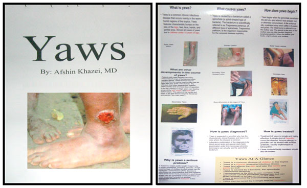 Research conducted by Dr. Afshin Khazei, an emergency physician from Canada and Daniel Peter, a local nurse practitioner, discovered that Yaws was a significant problem on Tanna. Dr. Khazei created public education posters on the Disease Yaws that were then translated into Bislama, the local language. The posters were distributed to the medical outpost stations for public display and local village education. A one-day seminar was held by Dr. Khazei for 16 of the total 32 aid-post workers on Tanna to provide education on Yaws prevention, diagnosis, and treatment.